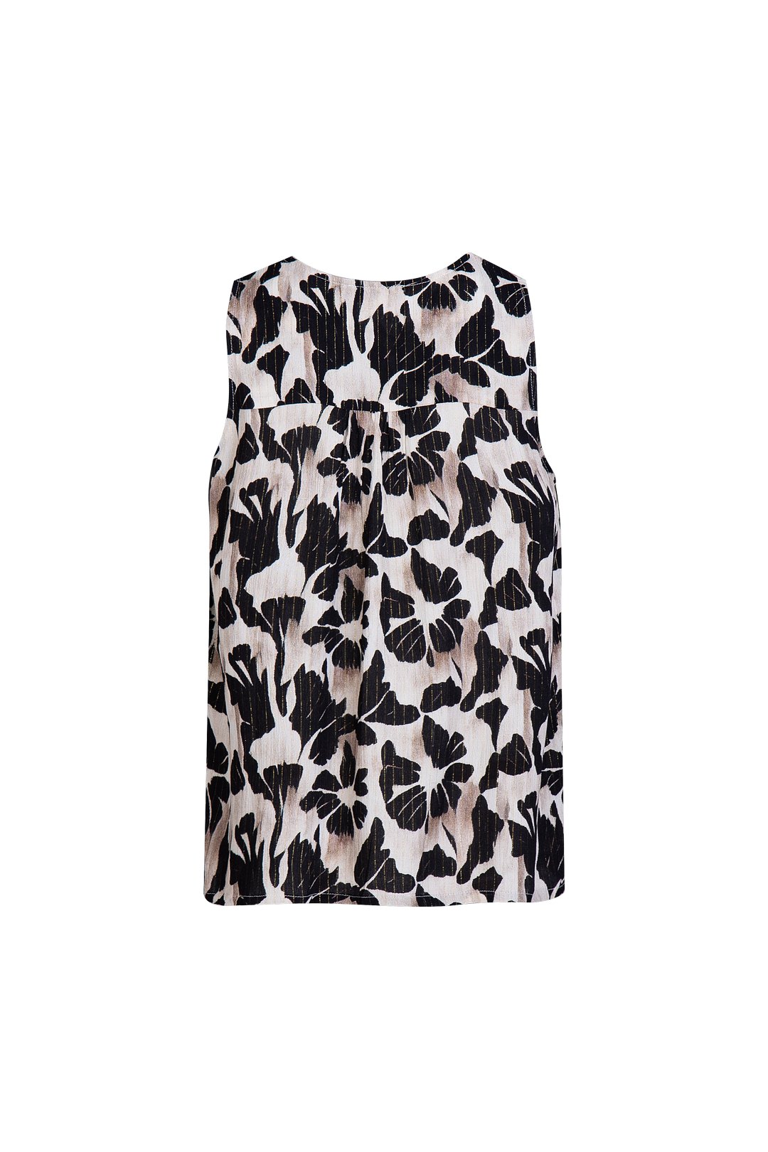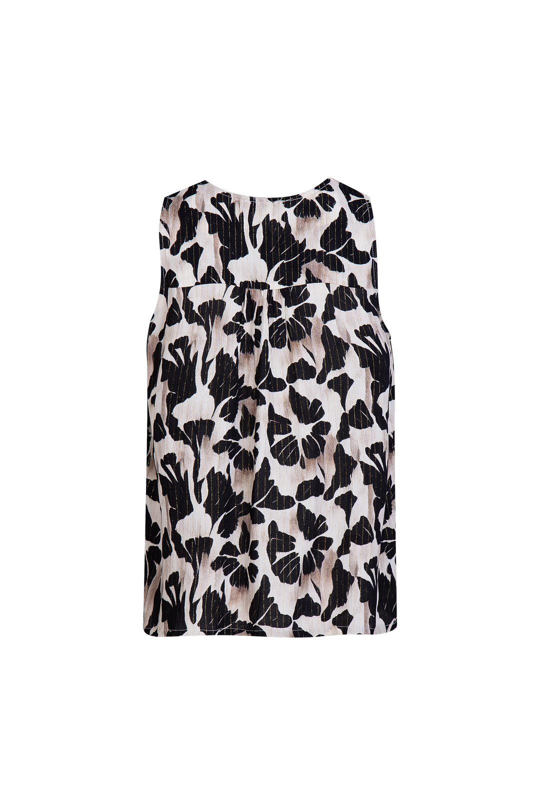 Geef je zomerlook een chique uitstraling met de Dominica top. Deze mouwloze top heeft een recht model met een knoopsluiting en is voorzien van een elegante print met een subtiele glinstering. De top is gemaakt van viscose en kan als set gedragen worden met de Beria broek.