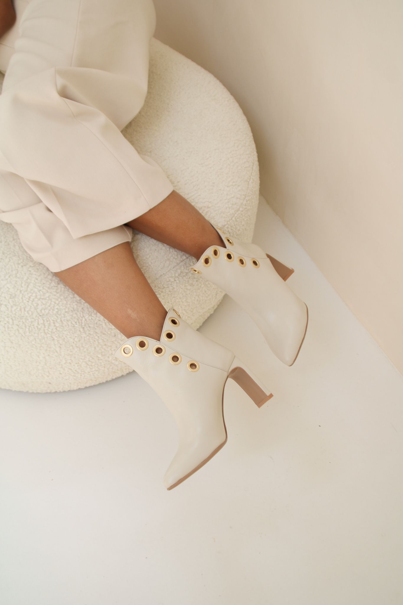Wow zo mooi! Deze moet je hebben. Deze exclusieve elegante enkellaarsjes zijn echt uniek door de mooie details van de mat gouden ringen en passen onder iedere outfit. De schacht hoogte is ongeveer 15 cm.