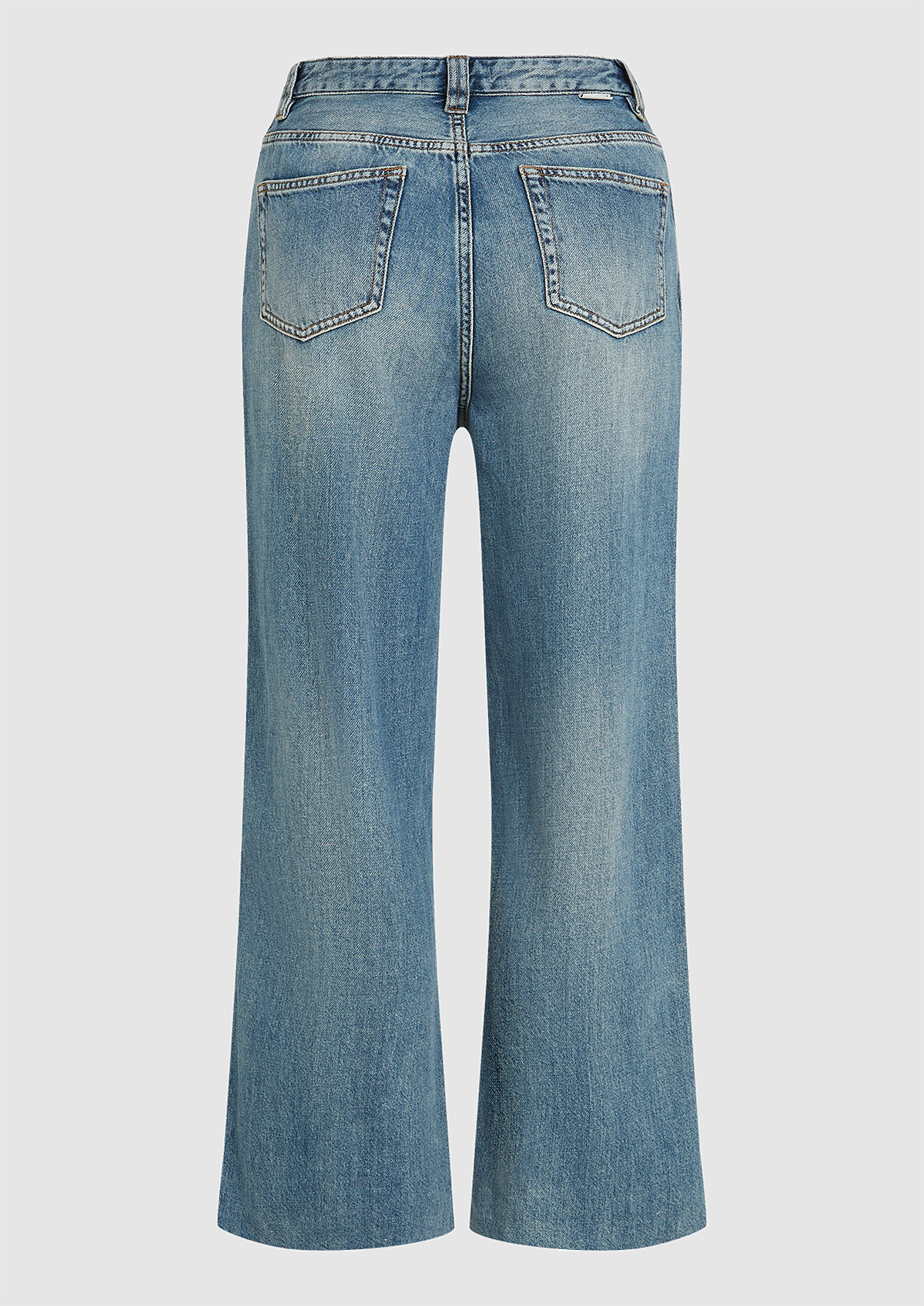 Wijdvallende cropped dames jeans met een hoge taile gemaakt van stretch denim. de Alfie is uitgevoerd in een blauwe wasing met lichte fade e heeft gerafelde broekspijpen