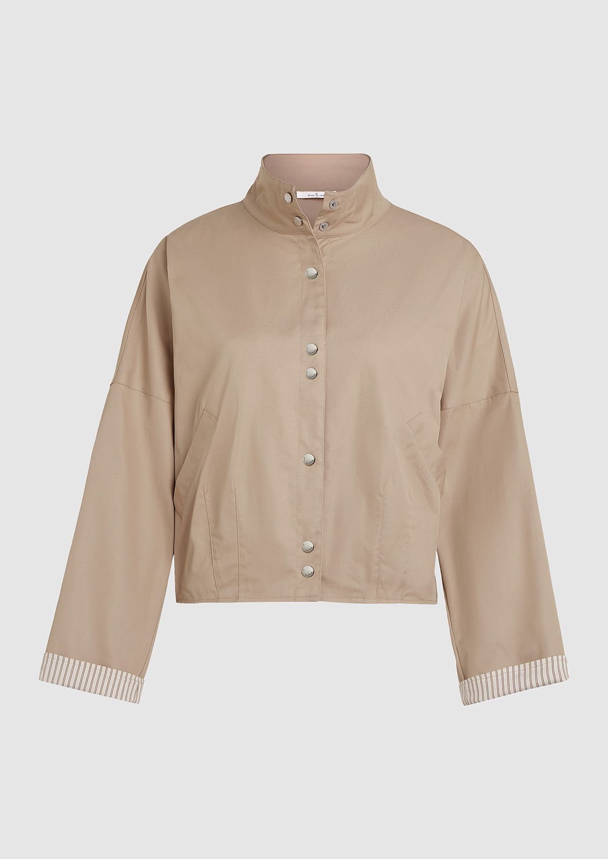 Khaki loose fit dames jack met een boxy fit en drop shoulders. Het Jessie jack heeft een knoopsluiting, steekzakken en een elastische boord. Het jasje is afgewerkt met een gestreepte voering die zichtbaar is als de mouwen zijn omgeslagen.