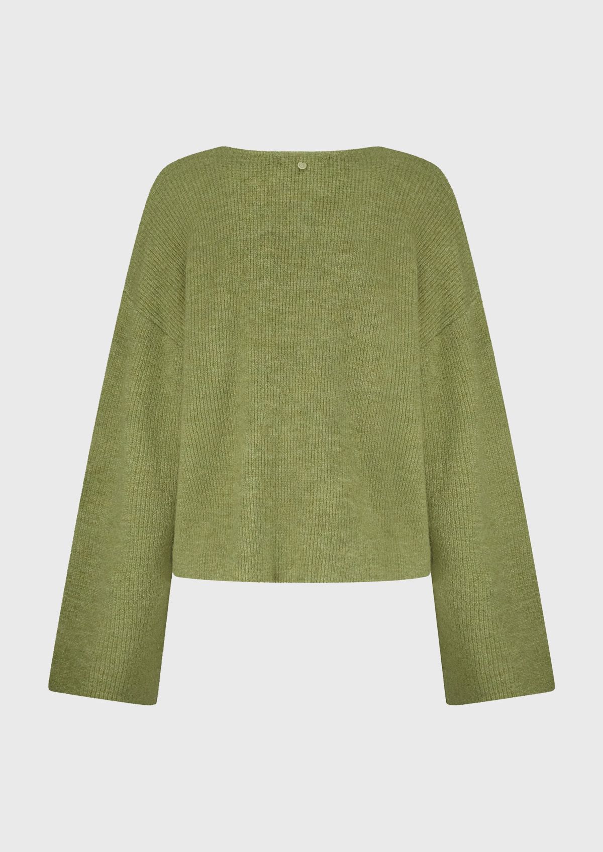 Gebreid dames vest gemaakt van een warme blend in een gemêleerde olijfgroene tint. De Kimberly cardigan heeft een regular fit met een knoopsluiting en wijde mouwen.