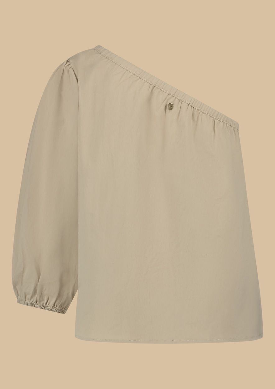 Dames blouse gemaakt van elastisch katoen in zandkleurige tint. De Marloes one shoulder blouse heeft een loose fit, elastische band in de hals en een enkele mouw.