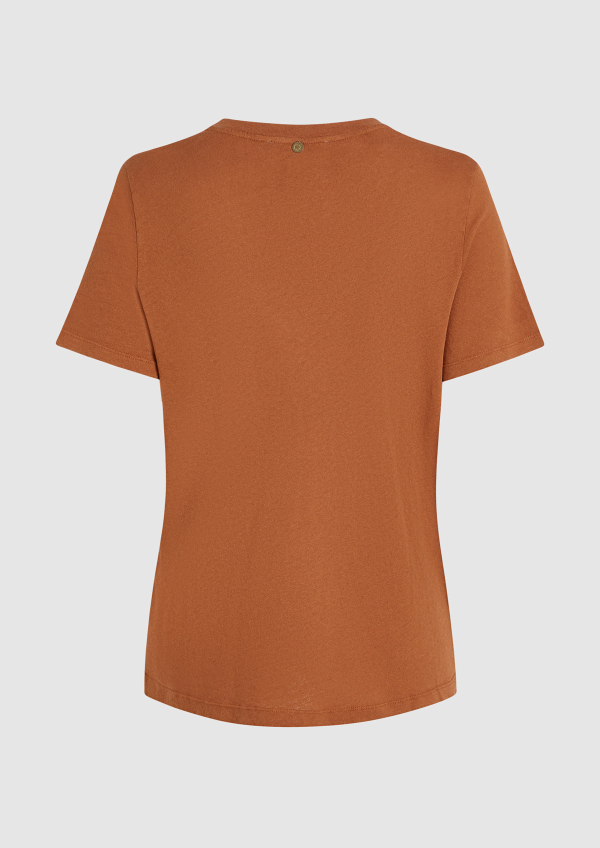 Licht doorschijnend dames t-shirt gemaakt van een zachte blend van katoen en linnen. De Mila tee heeft een regular fit met een v-hals en is uitgevoerd in het roest bruin.