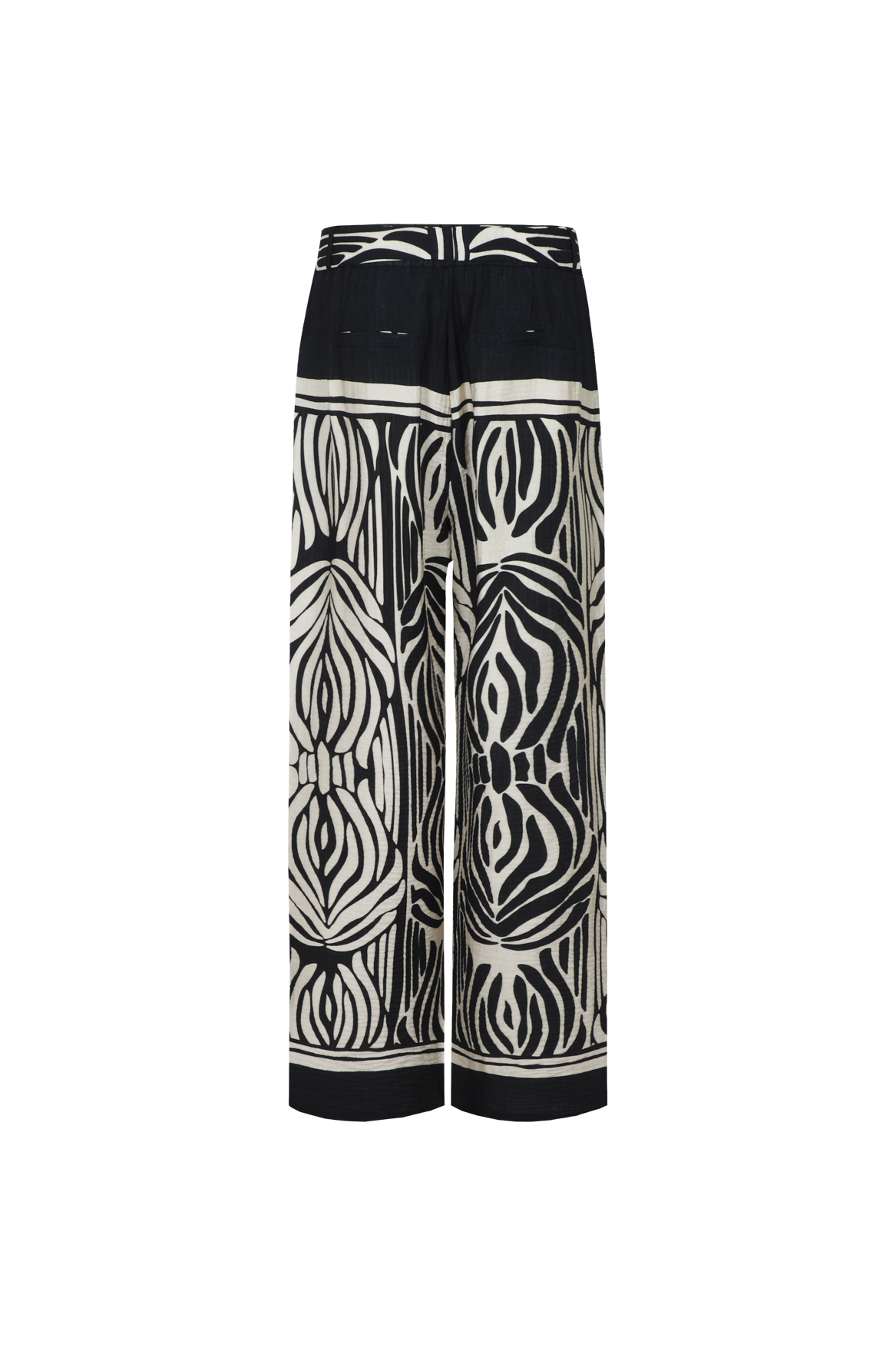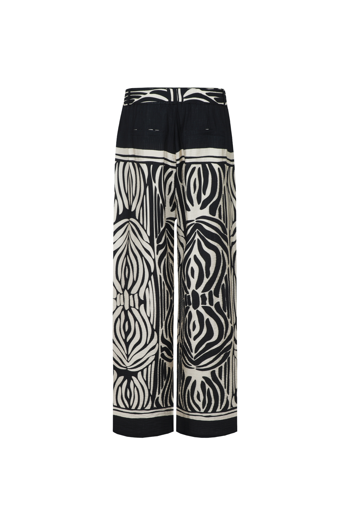 De Ilsebel broek is een opvallende pantalon met een krachtige all-over print. Het model heeft een rechte, losvallende pijp en een comfortabele tailleband die zorgt voor een prettige pasvorm. Dankzij de soepele stof beweegt de broek elegant met je mee en creëert hij een stijlvol silhouet. Combineer met de bijpassende top voor een complete statement look of draag met een rustige basis voor een gebalanceerde outfit.