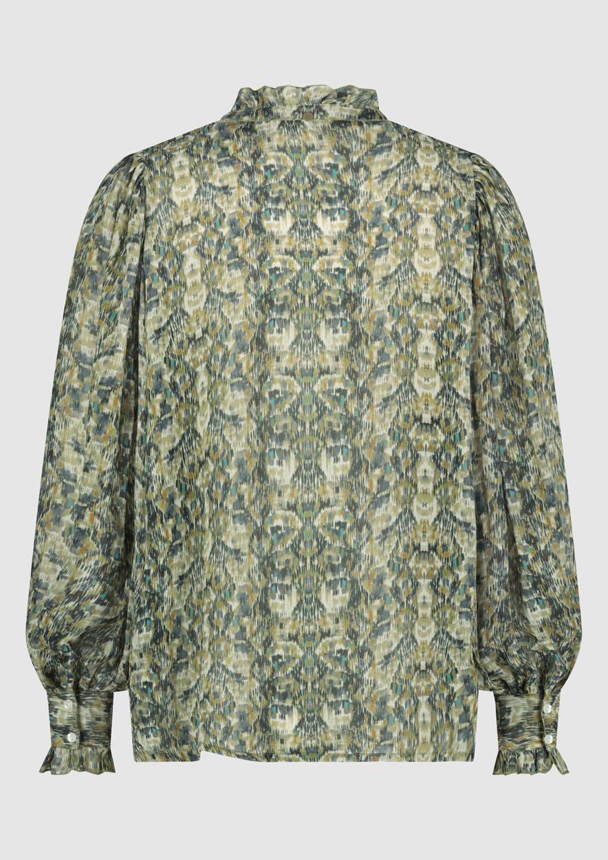 Dames blouse gemaakt van zacht viscose met een all-over seizoensprint. De puck blouse heeft een loose fit met wijde mouwen, de hals en manchetten zijn afgewerkt met ruches.