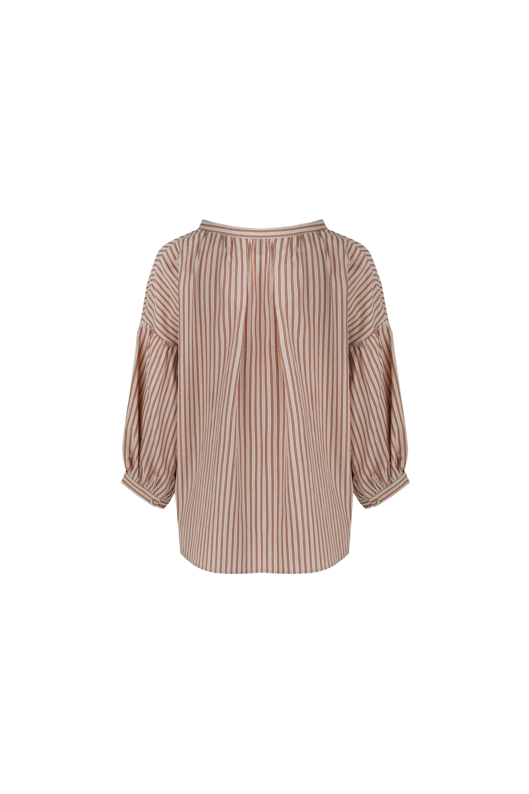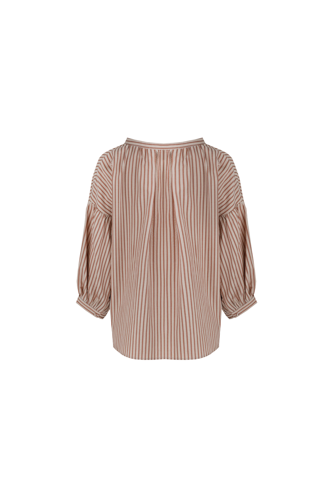 De Renata Blouse straalt eenvoud en elegantie uit. Het ontwerp bevat subtiele details zoals een klassieke kraag, pof mouwen en een zachte, vloeiende streep stof. Perfect om te combineren met de Azura short voor een complete look.