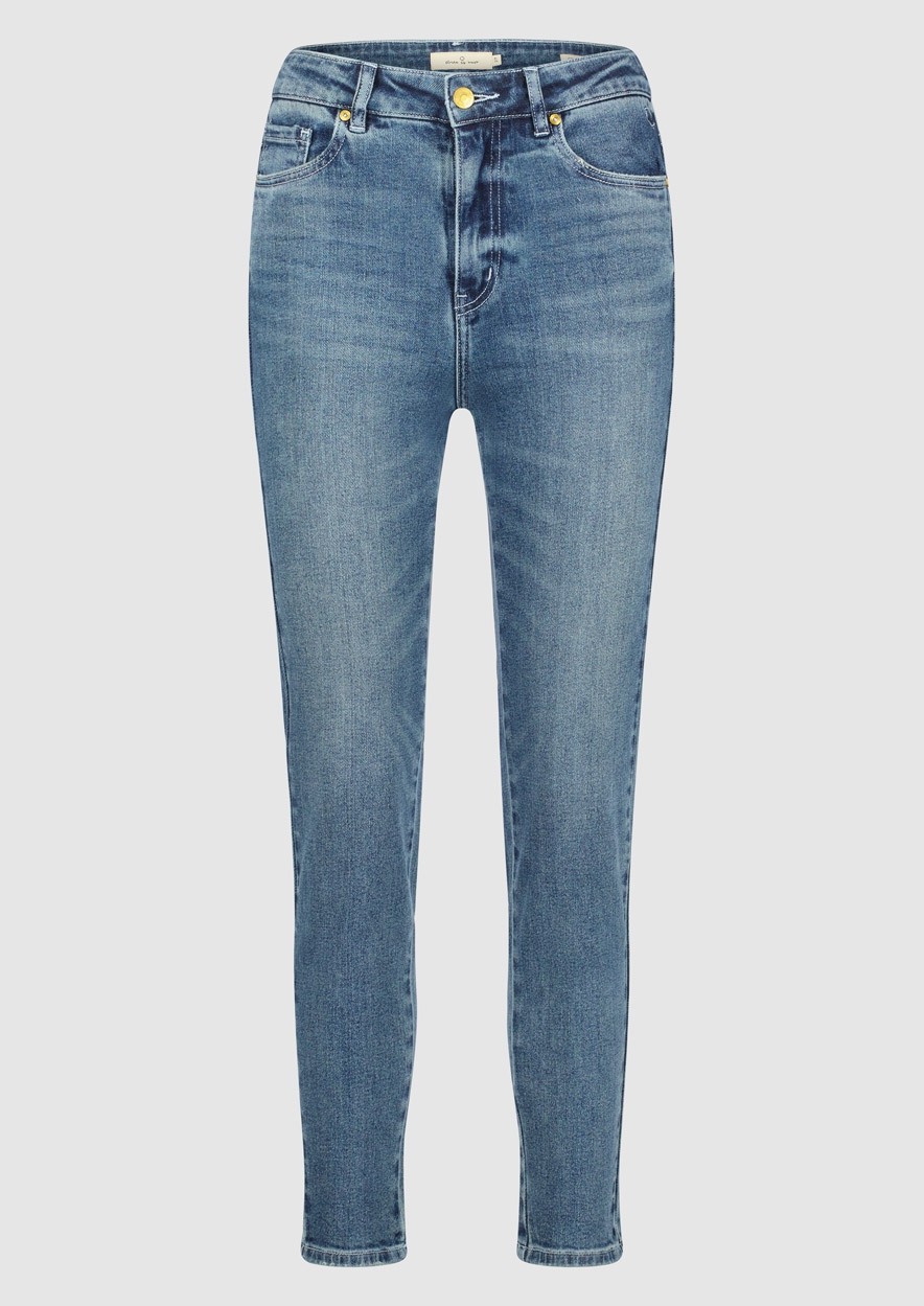 De Chloe is onze mom fit denim, dit model zit los aan de bovenkant van de benen en loopt taps toe. Dit model heeft een hoge taille met een 5-pocket design en is uitgevoerd in een blauwe wassing met een lichte fade.