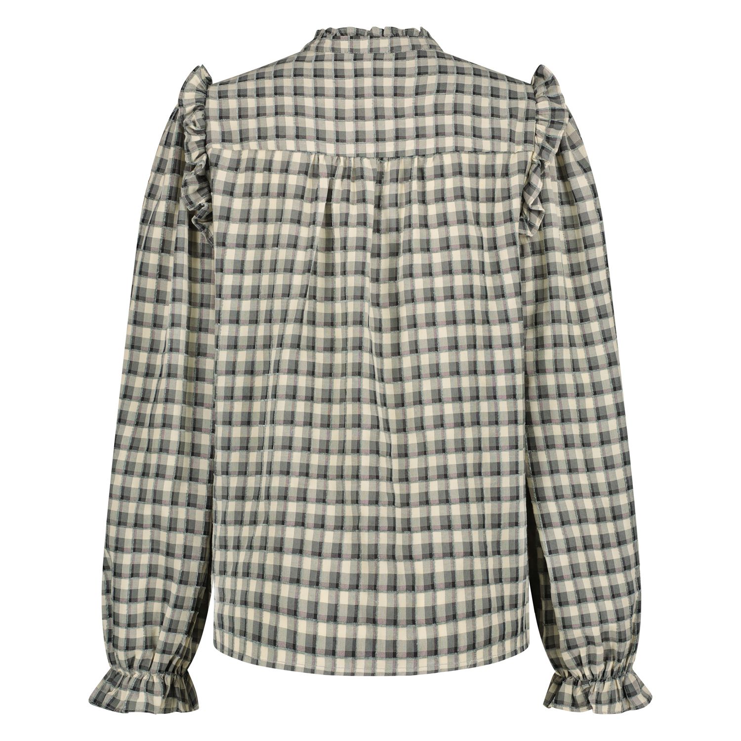De Malagana blouse heeft lange mouwen en een lage kraag met roezel. De blouse heeft een overall print, een knoopsluiting en ruges op de schouders en borst. In de uiteinde van de blouse zit elastiek verwerkt.