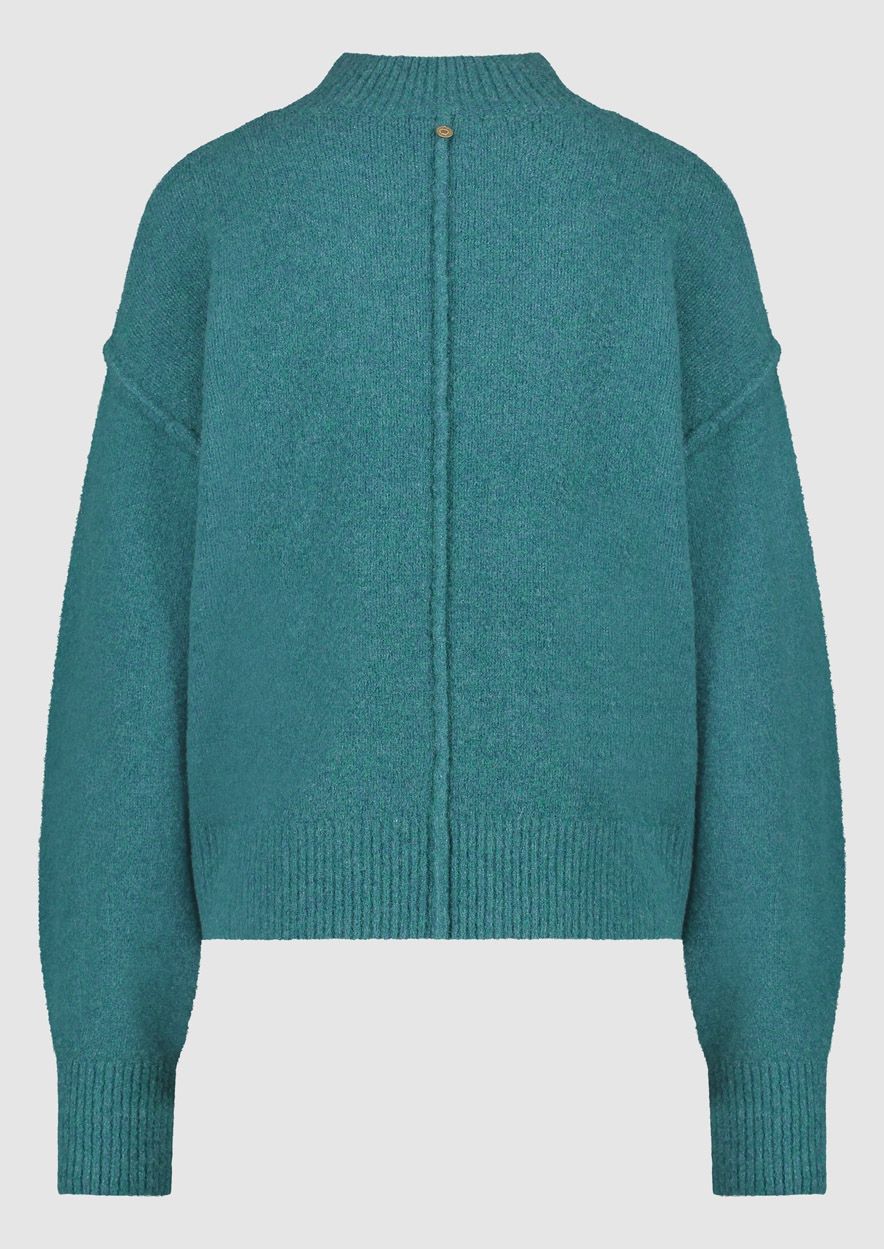 Fijn gebreide damestrui met een loose fit en drop shoulders in een petrol blauwe tint. De Jessie knit heeft een ronde hals en een verticale naad op de rug.