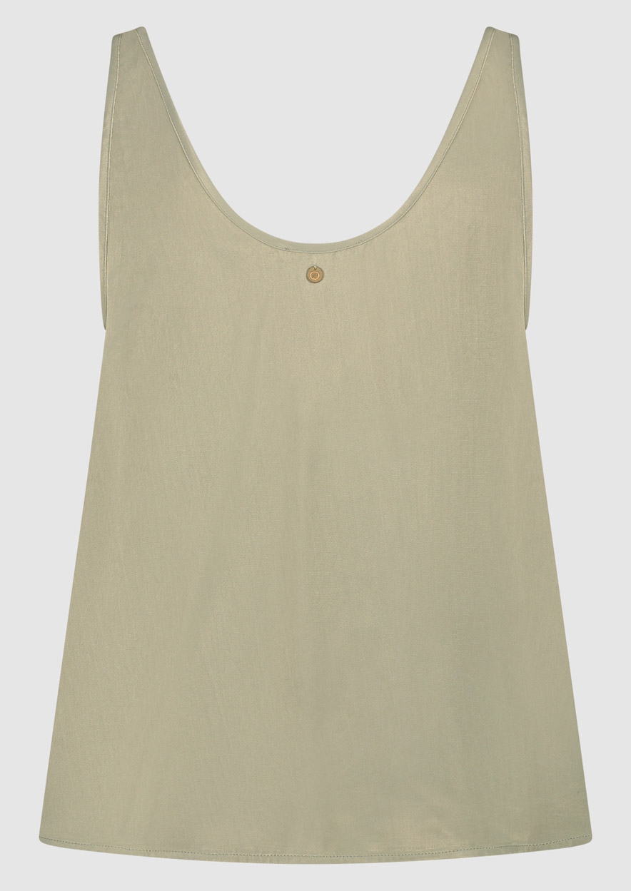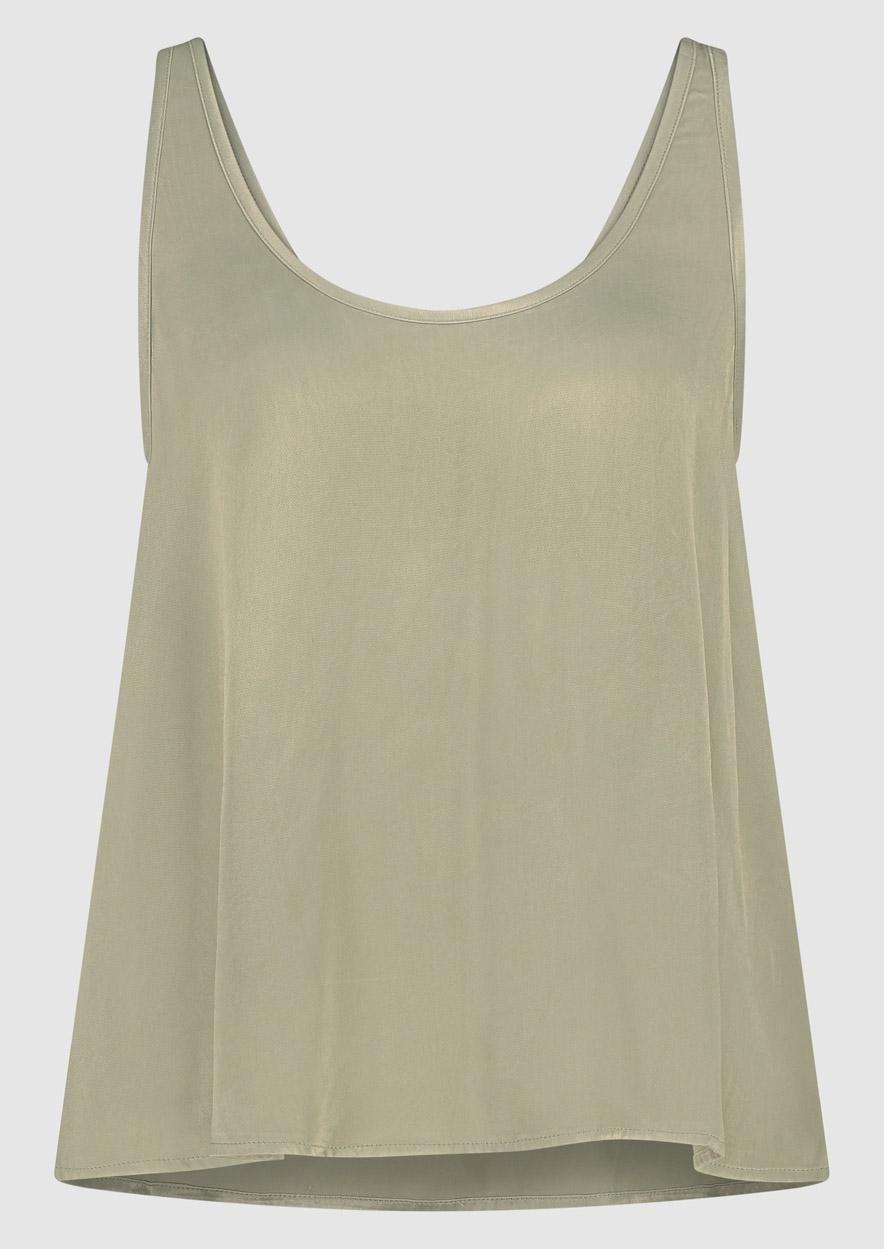 Mouwloze dames top gemaakt van glad viscose in een olijfgroene tint. De Isabella top heeft een loose fit met een ronde hals.