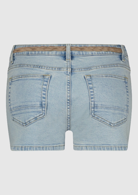Lichtblauwe denim shorts gemaakt van stretch katoen. De Stevie short wordt geleverd met een gevlochten riempje.