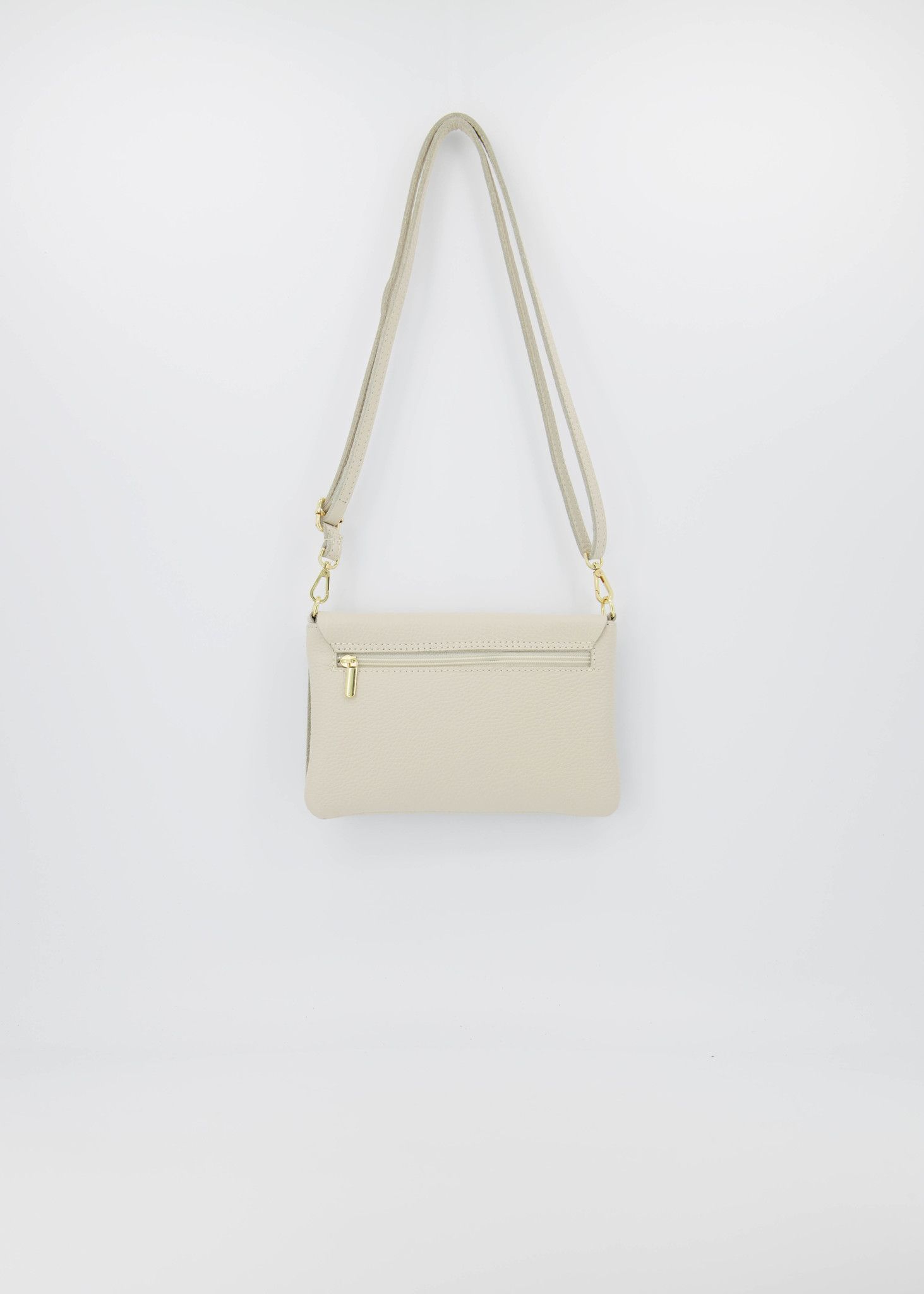 Leren crossbodytas met een groot binnenbak en een vakje aan de achterkant met ritssluiting. De tas heeft een verstelbaar hengsel.