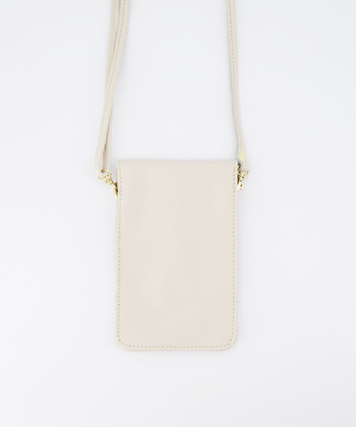 Leren handig telefoontasje met 2 vakjes aan de binnenzijde. De tas heeft een lang hengsel.
