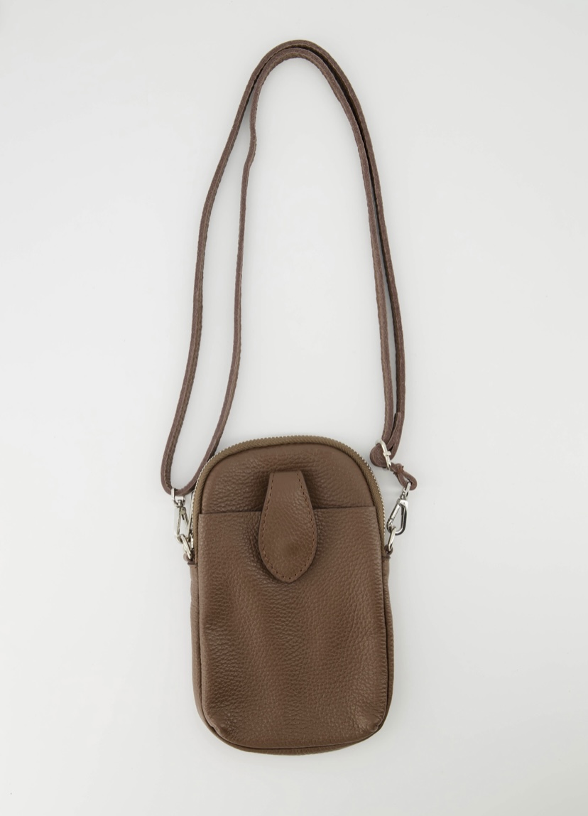 Leren telefoontas met een ritsafsluitbaar binnenvak. Aan de voor en achterzijde zit er ook een vak. De tas heeft een lang hengselverstelbaar hengsel.