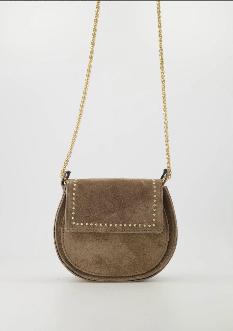 Suede crossbody tas met een lang ketting hengsel en studs op de voorkant.