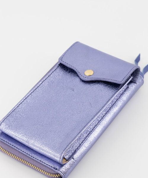 Leren portemonnee met telefoonvak op de voorkant en wordt geleverd met een afneembaar en verstelbaar hengsel. De portemonnee heeft een vakje en ritssluiting voor muntgeld, meerdere vakjes voor pasjes en ruimte voor briefgeld.