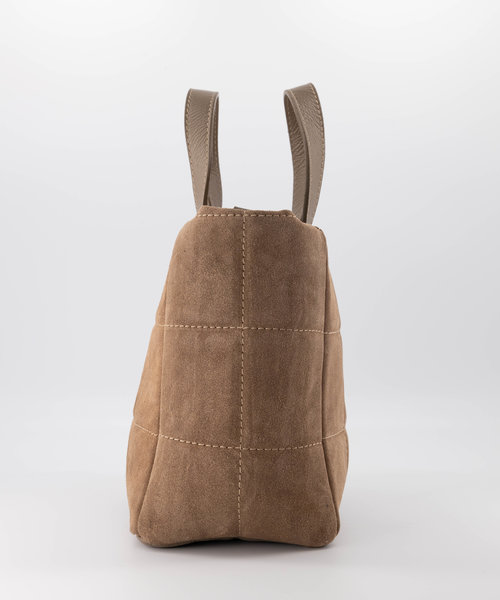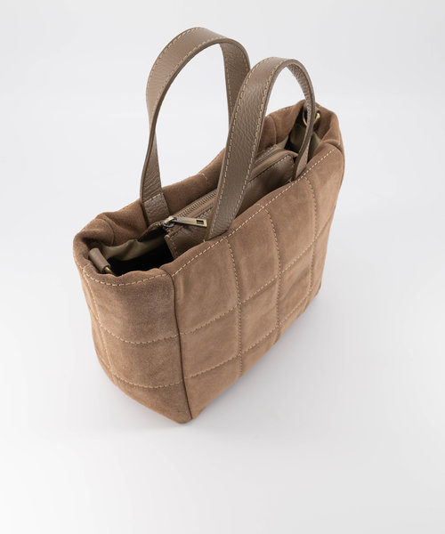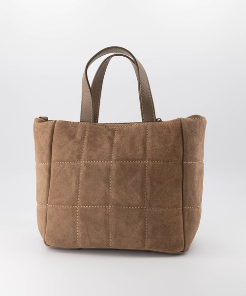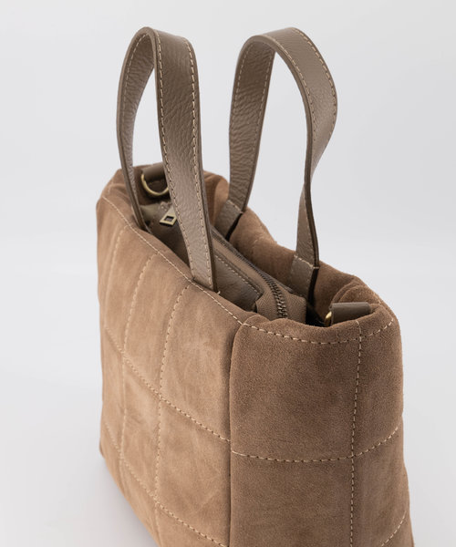 Juniper is een suede leren handtas afgewerkt met genuine leer. De handtas kan ook gedragen worden als crossbodytas door middel van een afneembaar en verstelbaar hengsel. Juniper heeft een groot binnenvak met aan de binnenzijde 2 steekvakken en een afsluitbaar ritsvakje. De handvaten en de onderkant van de tas zijn van glad leer.