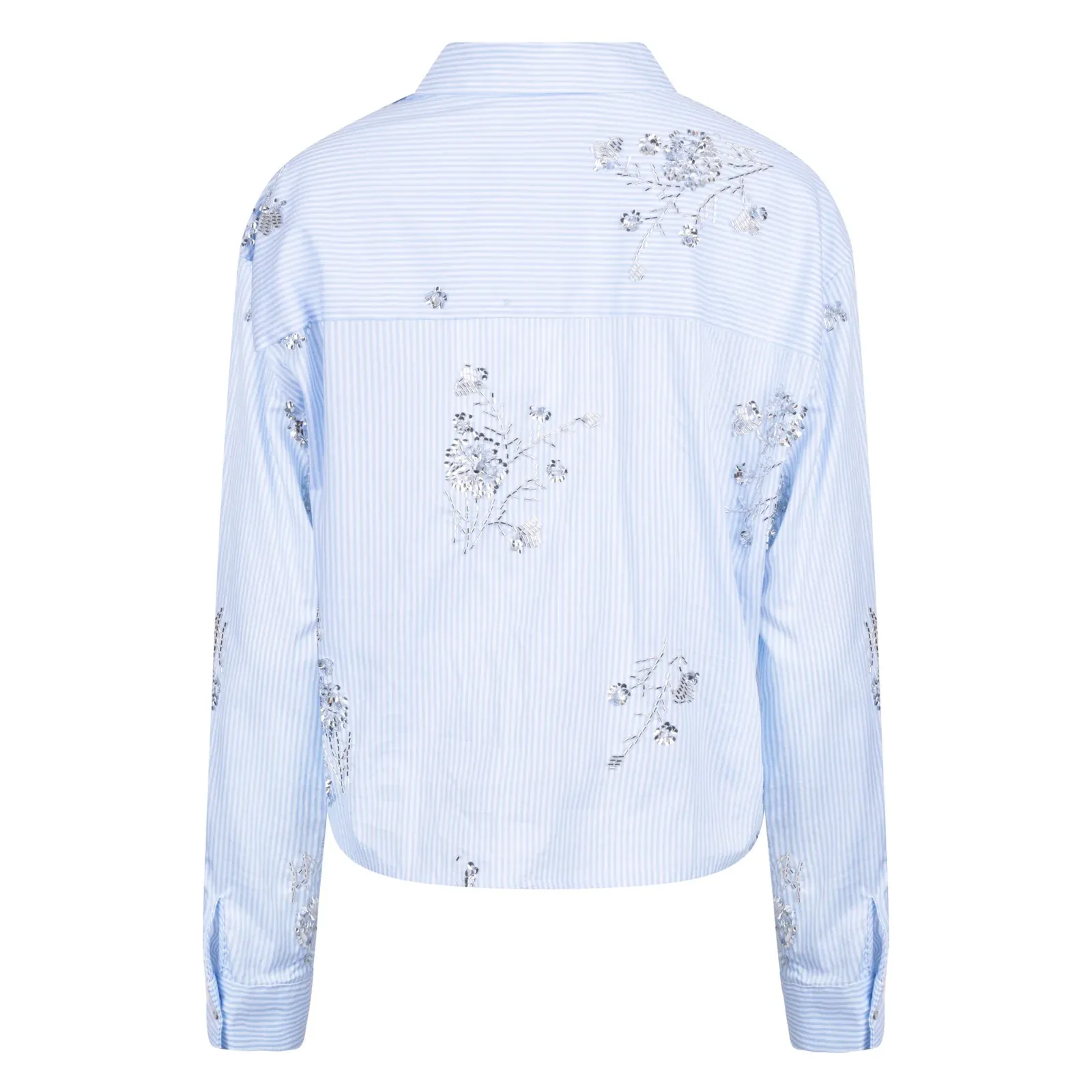 Deze lichtblauwe blouse straalt elegantie uit. Het kraagje en de blinde sluiting zorgen voor een clean en verfijnd silhouet. De zilvere pailleten geeft de blouse een luxe touch. Voorzien van lange mouwen en perfect om zowel chic als stijlvol casual te dragen.